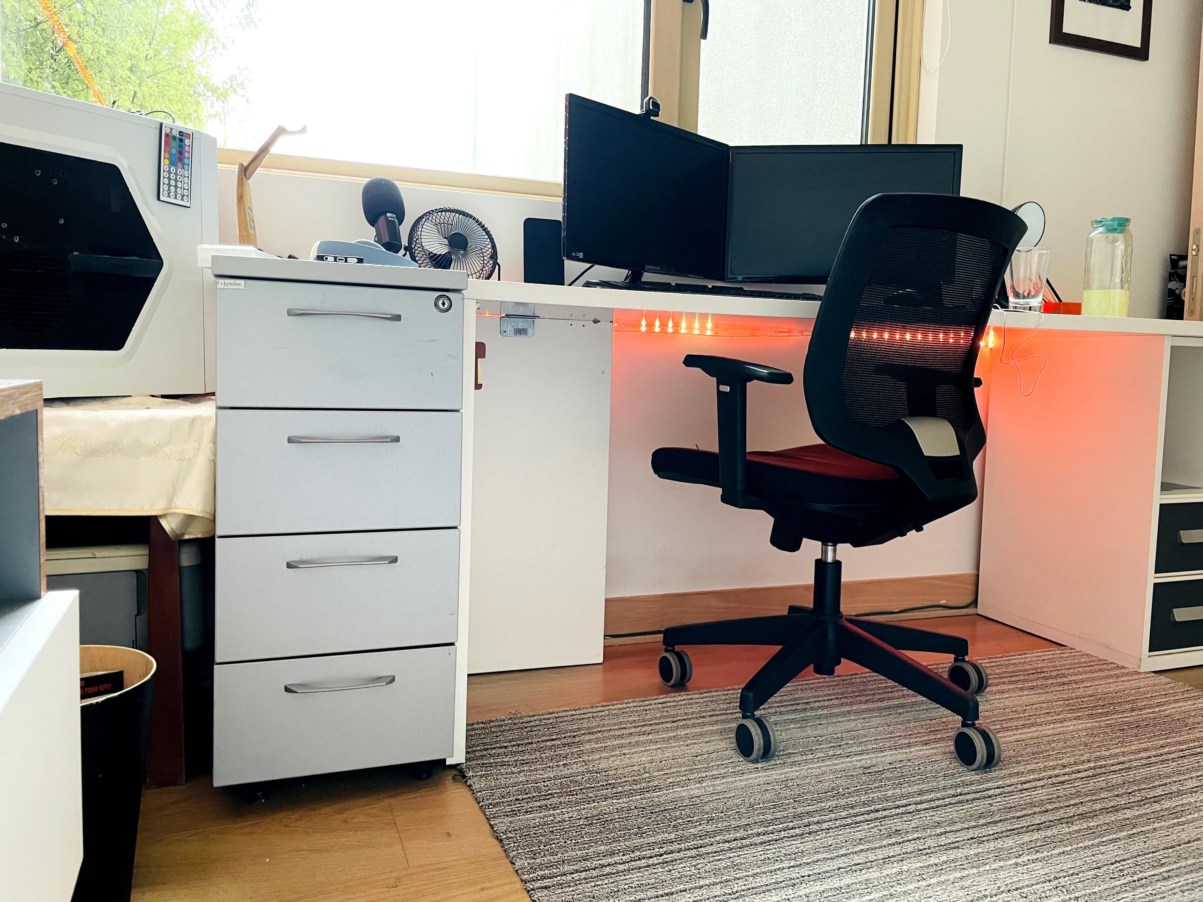 Sólo decir que en 2023 volví a cambiar de lugar y eso llevó a un nuevo setup, donde cambié la distribución de mi escritorio, agregué una pantalla extra separada de las principales, para poder ver videos mientras comía, estudiaba o dibujaba fácilmente, todo gracias a una pantalla pequeña y teclado inalámbrico.